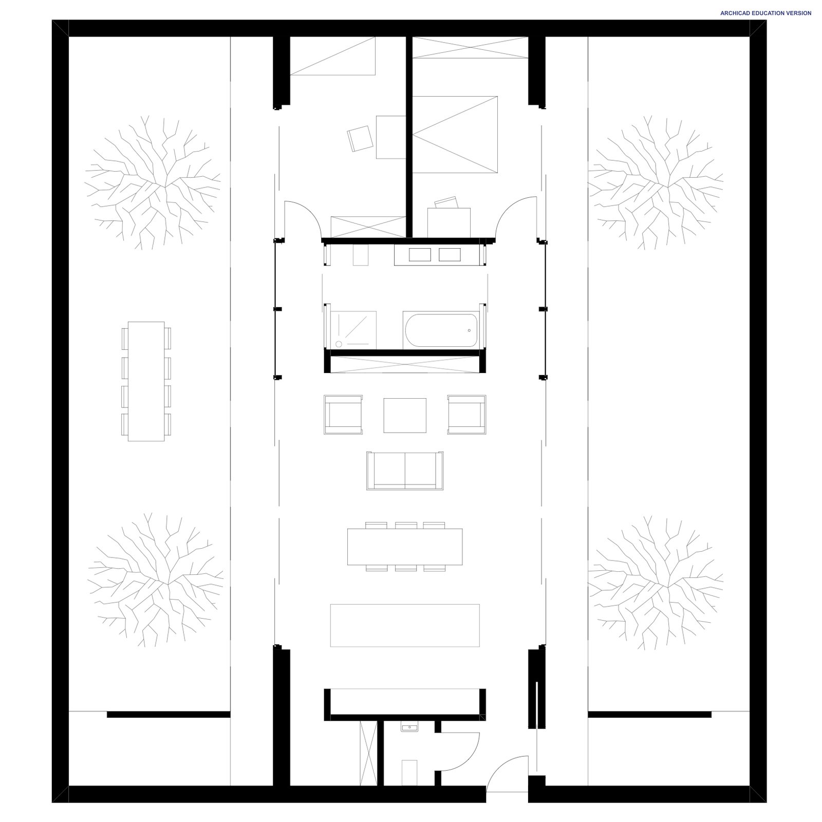 De woning is, tegengesteld aan een traditionele patiowoning waar de patio centraal ligt in de woning, anders opgevat. De woning ligt centraal met de patio errond, zo krijgt de woning het meeste zonlicht.